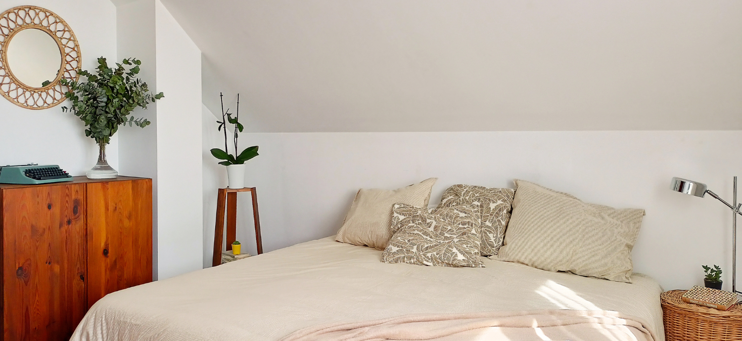 Por suerte, en la casa ya había algunos muebles que pudimos utilizar en nuestro Home Staging y así hacerlo más económico: el mueble en la entrada, las dos camas que juntamos para que la habitación abuhardillada parezca más espaciosa, una bonita cómoda de madera… Y luego, añadimos nuestros accesorios en tonos neutros y algunas plantas.